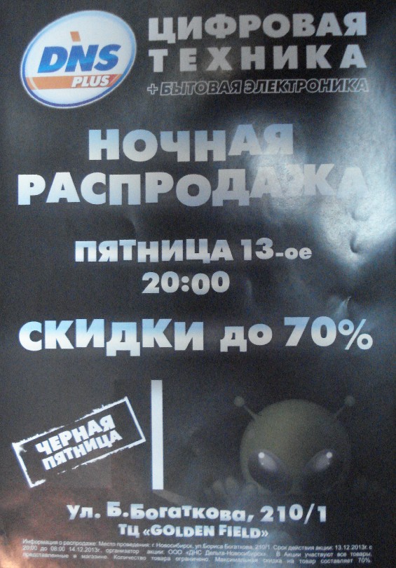 | Не будте наивными. Такая ночная типа "распродажа" в ДНСе была в ТЦ Бонанза (на Вокзальной магистрали) то ли весной, то ли летом. Мы туда ходили. Очередь огромная и дикая, нужные люди сразу стоящий товар со скидкой вытащили, на остальной товар ДНС сначала поднял в цене, а потом сделал небольшую скидку. 70 % было только у каких-то кабелей завалящих. В общем, картина печальная. |