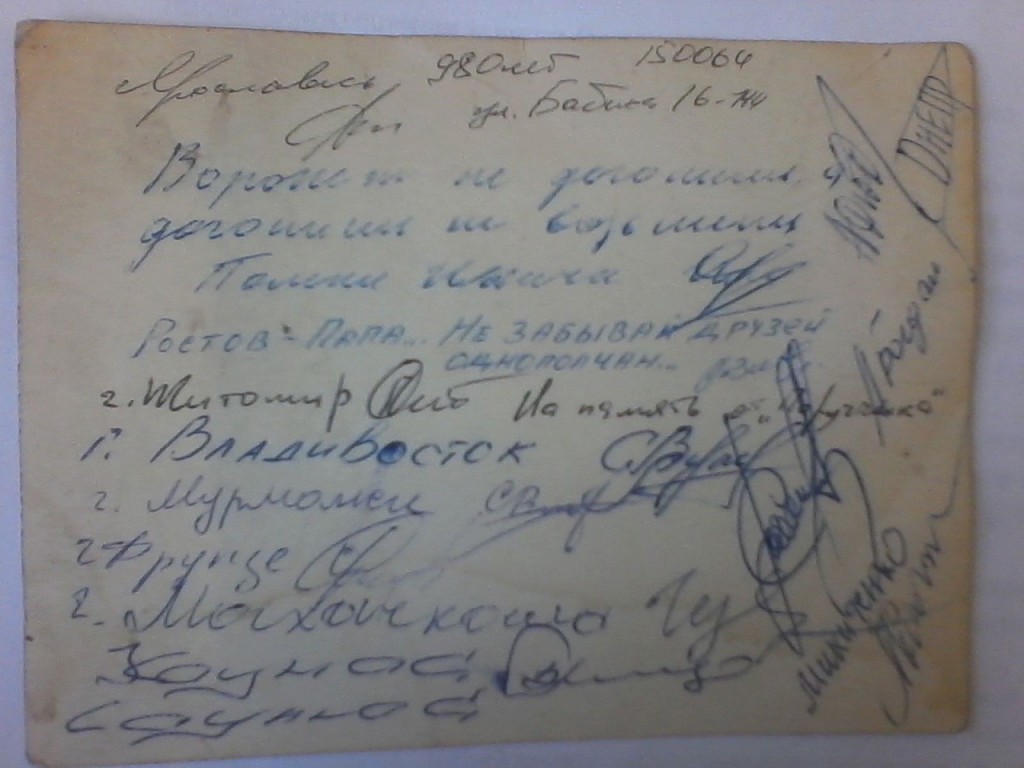 Это конец августа, третий месяц службы Харьковская учебка 1988год приехали с учебного центра под Чугуевым. Все чумазые, в пред последний день перед отьездом нам устроили учения сутки по окопам ползали. В часть ехали с мечтой помоемся постираемся, приехали а тут фотограф, А он редкость был появлялся всего 1-2 раза в месяц, ну сфотались как есть.