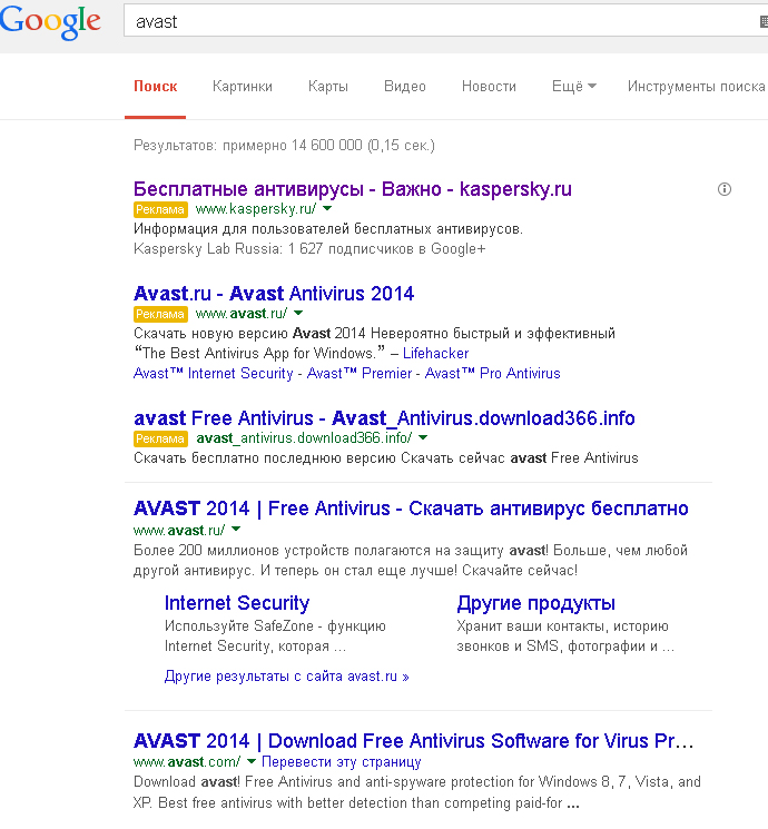 // первые 3 ссылки - реклама. фактическая выдача это 4ая ссылка и ниже, там оффсайт аваста как раз первый