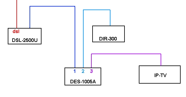 Здравствуйте народ, проблема такая подключил недавно IP TV от Ростелекома, подключили на старый модем Интеркросс, я все переделал так как с Интеркроссом не работал wi-fi, в итоге либо wi-fi, либо ip tv. Сейчас стоит модем D-Link DSL-2500U, свитч D-Link DES-1005A и роутер D-Link DIR-300, схему подключения прилагаю, так вот в чем вопрос, как сделать так, чтобы был и wi-fi и ip tv?