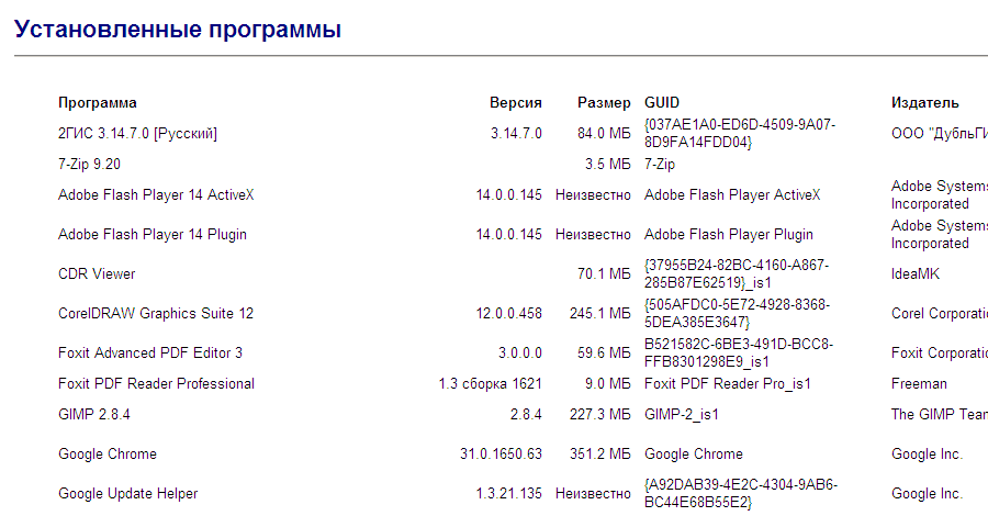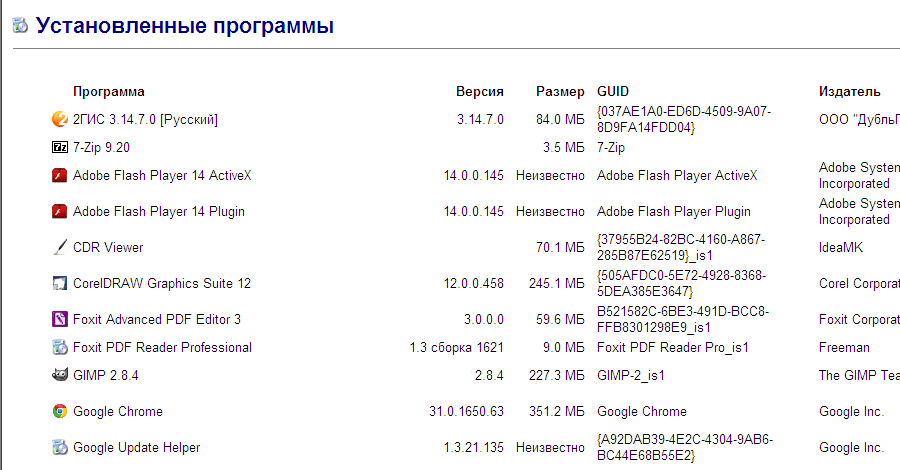 В Аиде тыкаю-только программы-она десять минут думает и извергает тааааакой отчётище-не прочитать не распечатать.. Через десять минут нашёл в нём список установленных прог с мусором типа-сервис паки,хотфиксы,обновления.. Т.е. этот отчёт надо ещё и обработать глазами и руками,загнать в ворд,навести красоту и листов на пять распечатать... Это доооолго очень.