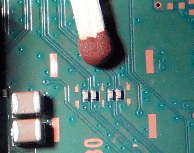 Мелковатая пайка там оказывается. По фото в первом посту не понятно. Сфотал на фоне спичечной головки. Если восстанавливать как было, левая пара резисторов по 80кОм, правая по 42 кОм.
