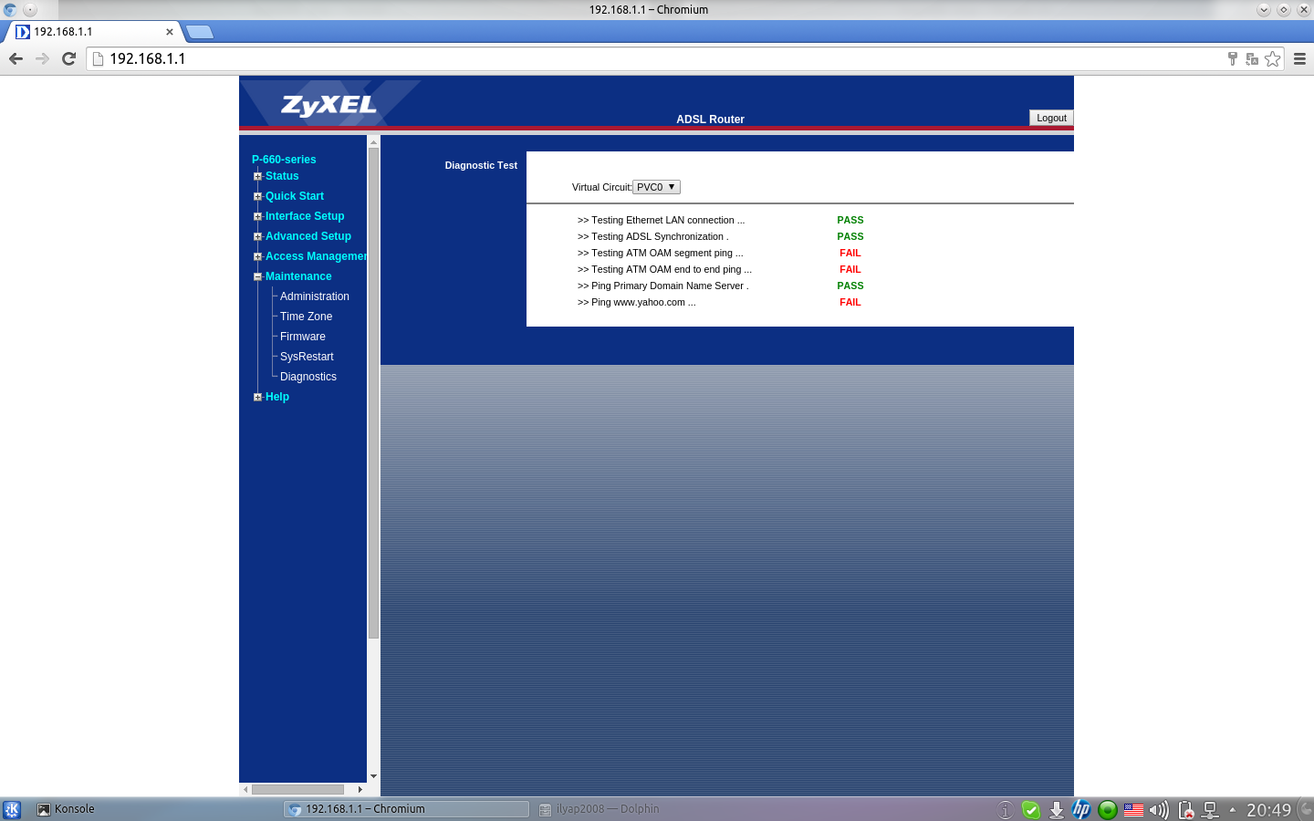 Первым делом "мастер" открыл web интерфейс модема и начал мне пояснять, что профиль 6 мб/c для показателей моей линии это очень много... На что я не согласился... Я заявил, что до вмешательства тех поддержке на этих же параметрах прекрасно работал профиль 8 мб/c, а также документация говорит, что мою линию можно считать хорошей... И разрывов как-бы нет... Вся проблема в их канале...