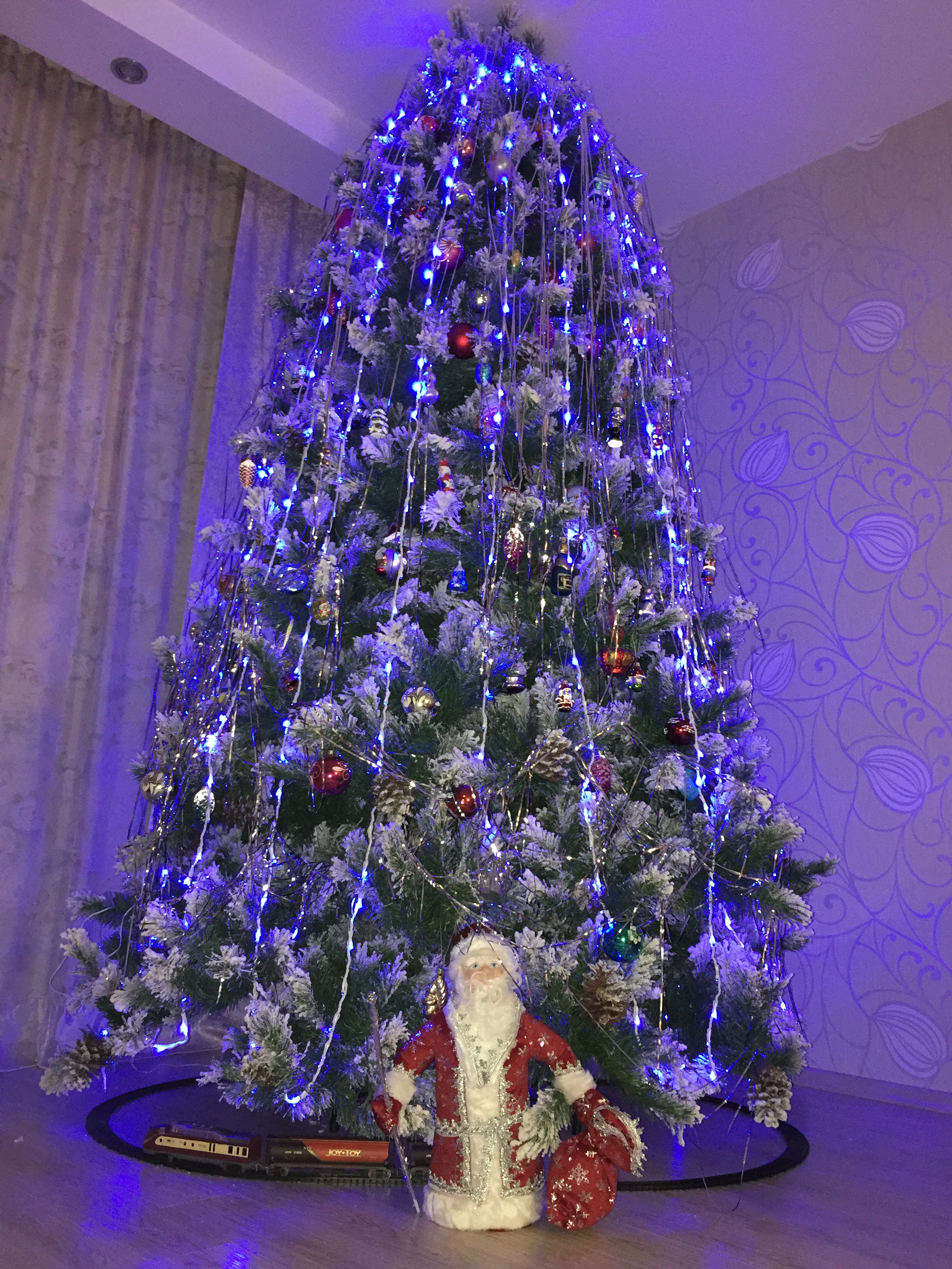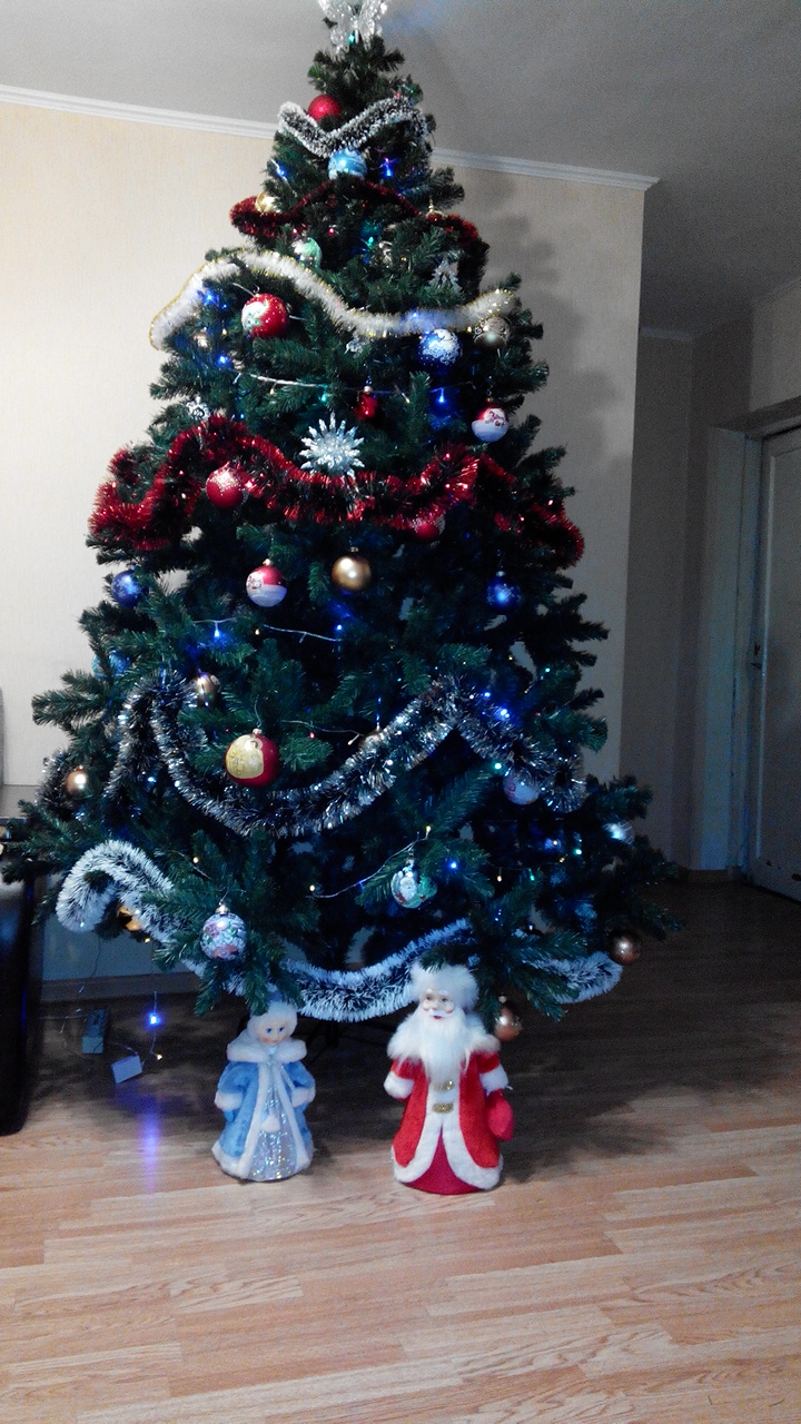 Снарядили нарядную ))) . Очень рекомендую те гирлянды что выше ссылку давал. За 9 баксов две светодиодных гирлянды с цветными светиками, с контроллерами на восемь режимов, по сто светиков в каждой, длиной 10 метров каждая. У нас таких цен долго ещё не будет.