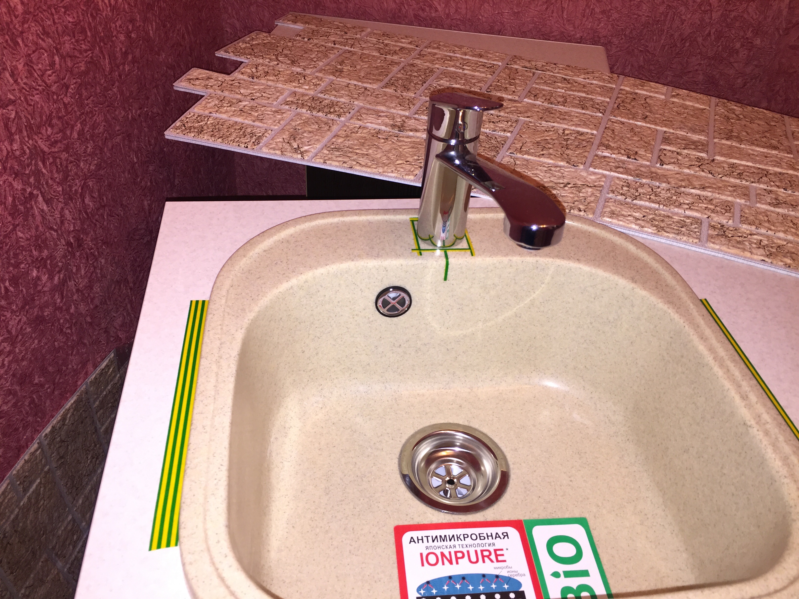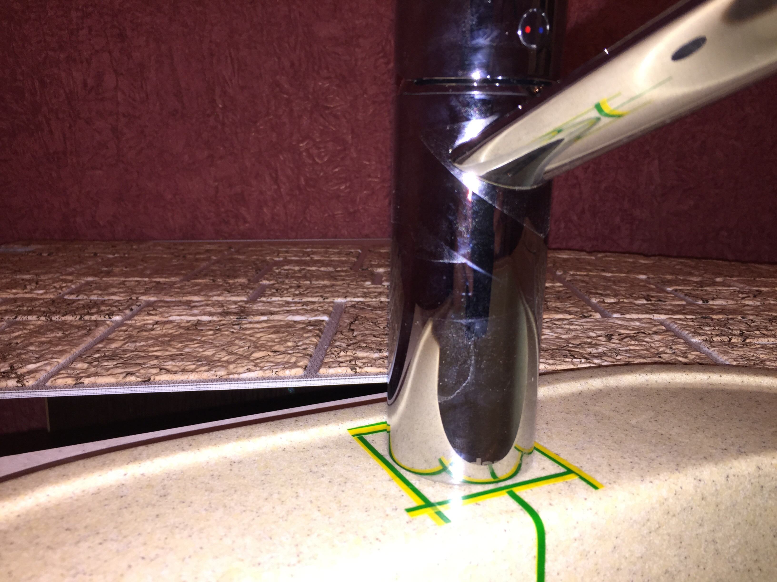 Вобщем поставил смеситель на ту резинку тонкую которая в пазу вчера ее еще на жидкие гвозди посадил, сейчас смазал за резинкой чуток у основания гвоздиками жидкими! Приблуду на скотче установил и затянул гайкой! Стоит мертво! Еще думаю засиликонить ту приблуду на скотче с низу мойки на всякий случай