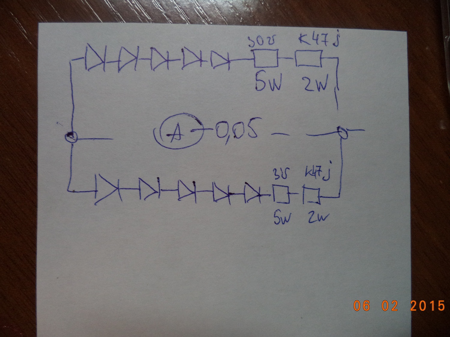 схема: пять диодов последовательно и 1 резистор в 30 ом. |