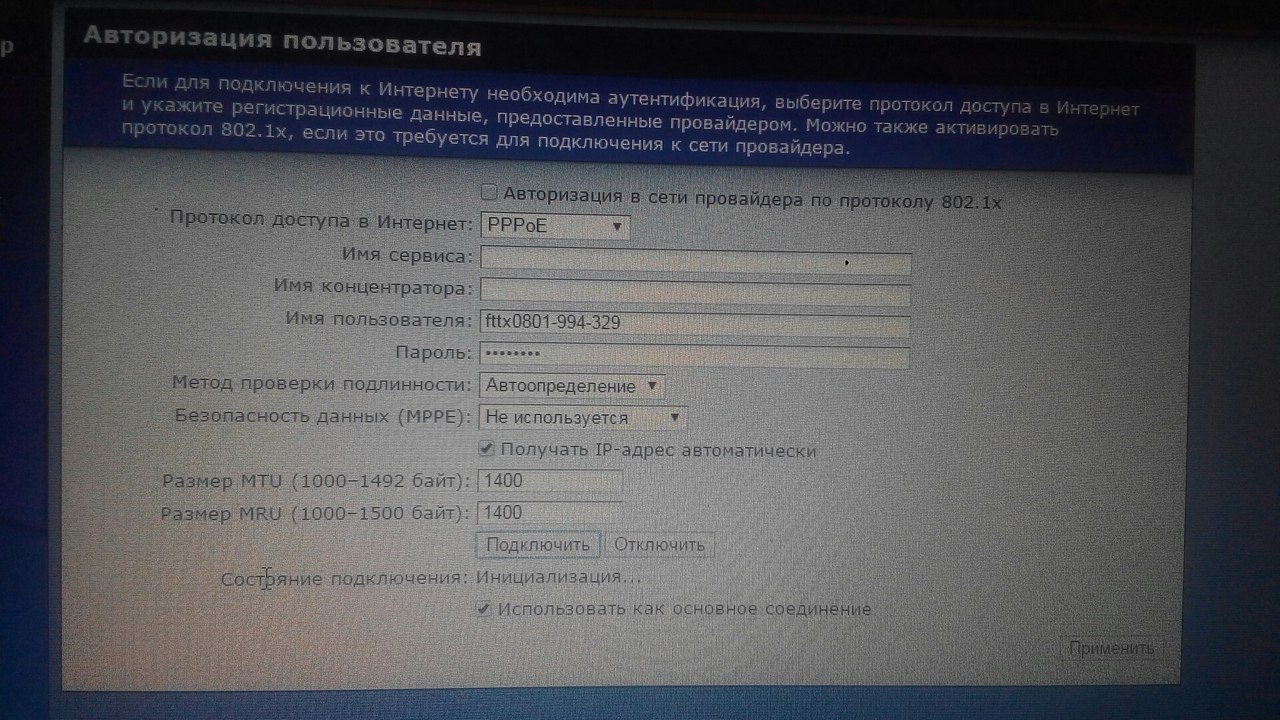 Может у кого было? Настройки прилагаю в скрин. Больше ничего не трогал только эти два раздела. В крации статус "Инициализация" и все на этом. логин пароль 1000 раз перебивал не думаю что проблема в них.. С компа все подключается без проблем а роутер не поднимает соединение. в ТП сказали привязки по MAC нет.