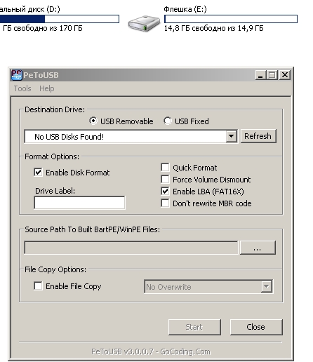 Хочу установить xp, но не получается. Потому что у меня 7 щас стоит, я испробовал все способы. Но мне сказали есть только 1 способ, xp можно установить с помощью usb_prep8 (PeToUSB), Я захожу в папку usb_prep8, потом нажимаю правой кнопкой мыши usb_prep8, от имени администратора. Потом открываю PeToUSB, и у меня не находит флешку. Но у меня нэтбук видит флешку, и запускаеться без проблем. А вот PeToUSB не видит....... Скажите как исправить, ПОЖАЛУЙСТА