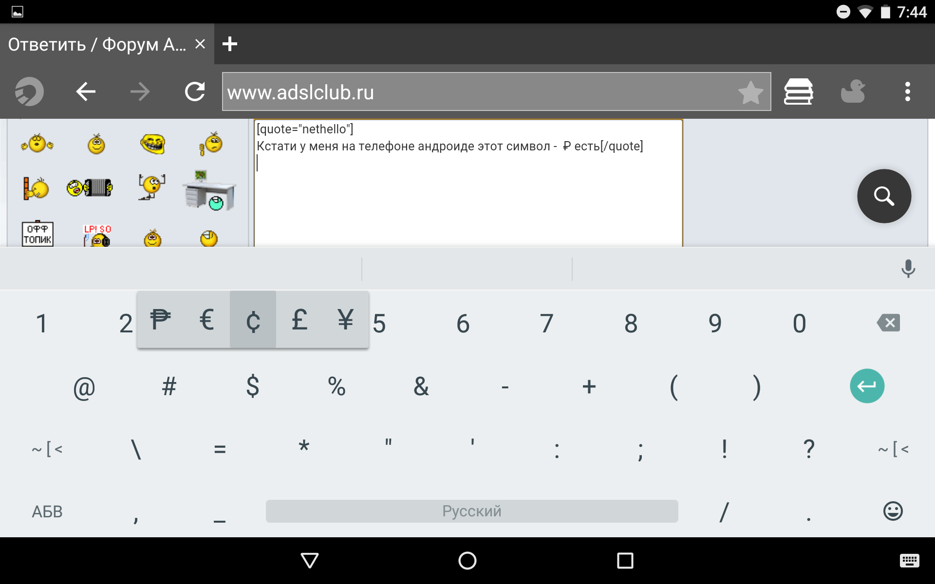 | Кто знает на android планшете как набрать Р с горизонтальной чертой (символ рубля)? |