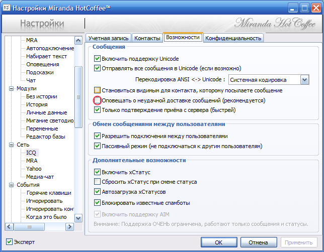 Но кривизны нет. Там достаточно настроек, чтобы настроить ВСЁ. Первое время такое колличетво пугало, а теперь понимаю, что это счастье. Миранда самый мощный клиент из всех возможных.