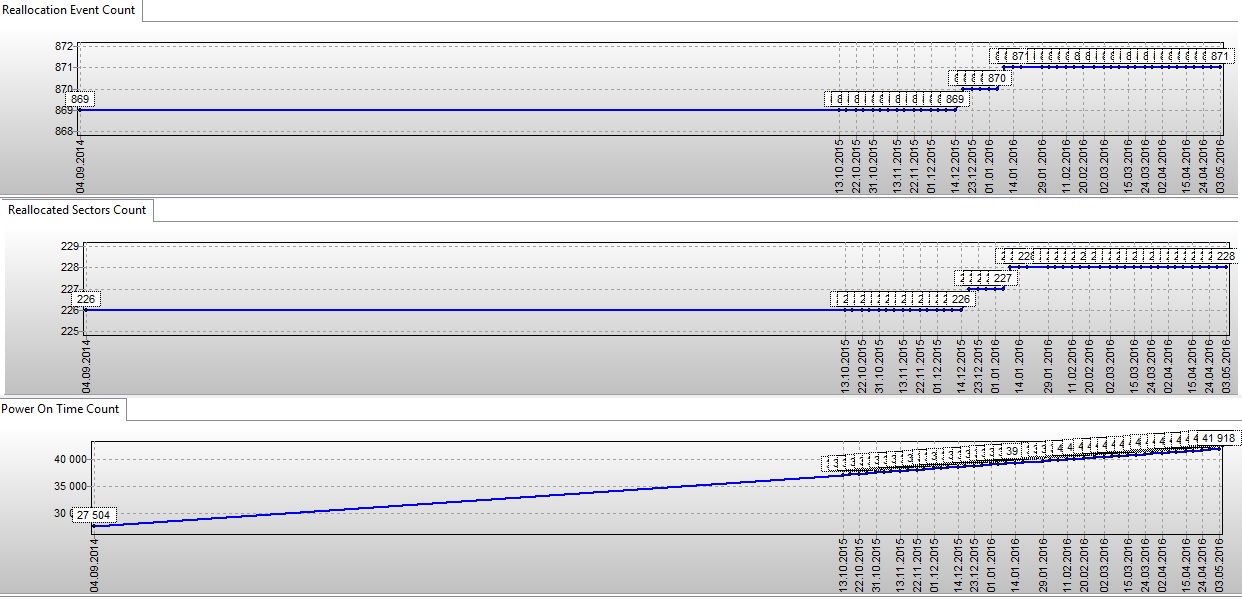 Но за полтора года значения изменились всего на 2 переназначенных сектора, а работает 24/7 в ненагруженном массиве.