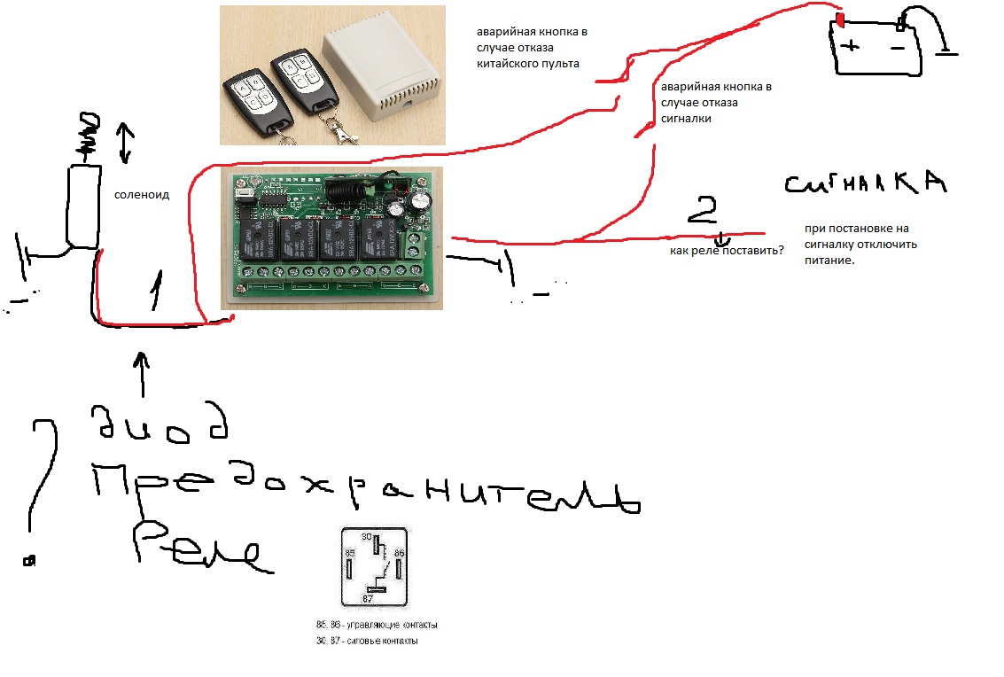 Есть авто без ручек. сейчас при снятии с охраны автоматом открывается дверь водителя. Надоело и решил замутить отдельный пульт. Купил реле с ДУ пультом. Вот теперь вопрос как это всё безопасно организовать. А именно надо ли в "1" ставить диод, предохранитель и дополнительное реле? Или в другое место его ставить? Как в месте "2" поставить реле чтоб при постановке на охрану питание от реле китайского отключалось? Какой провод надо на сигналке найти? Помогите электронщики...
