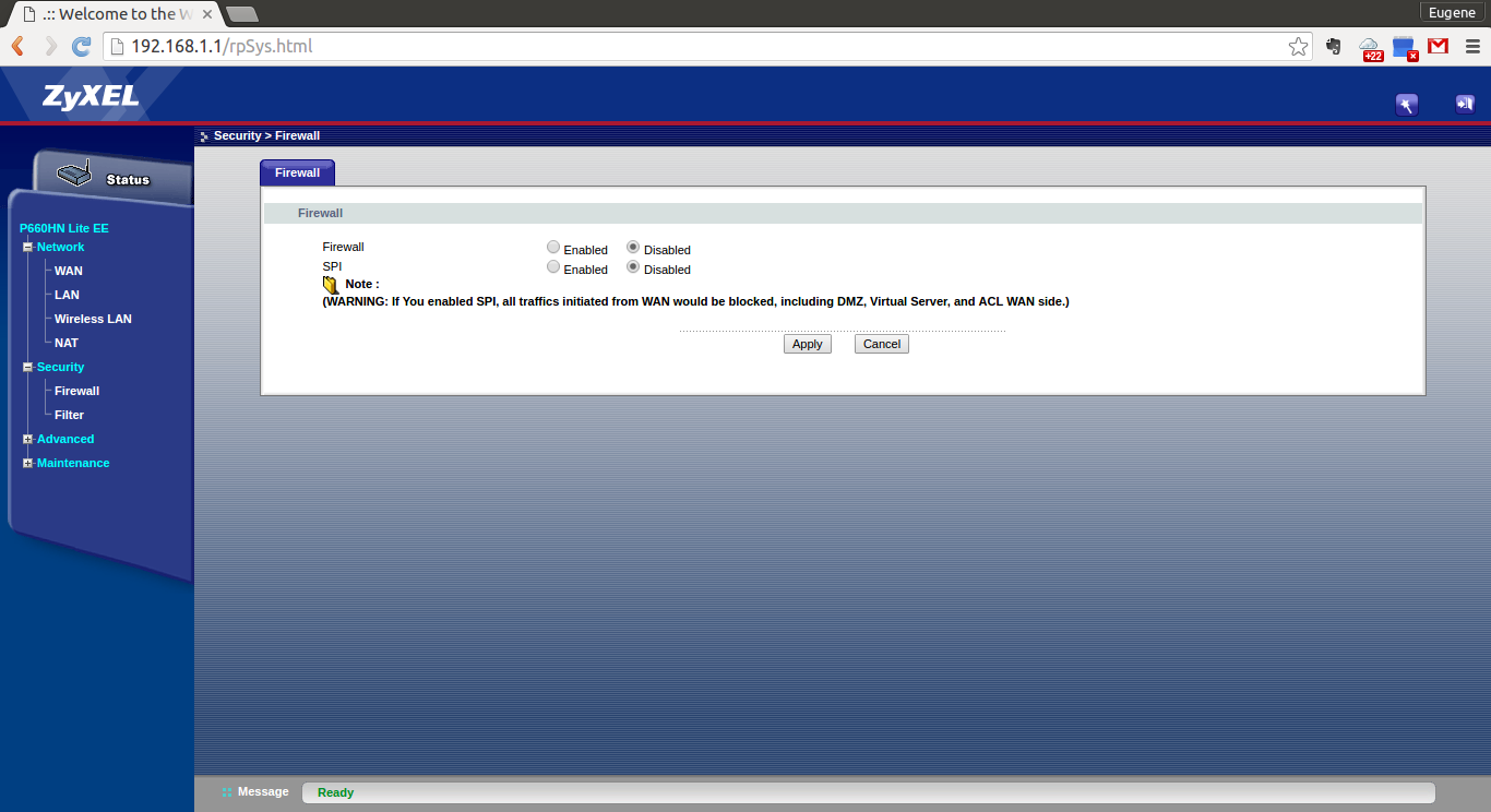 Я видел эту статью. Это не совсем про мою модель роутера. У меня нет правил, можно просто или включить фаервол или выключить. Ну и прошивка последняя судя по сайту zyxel ( 1.00(AAAF.0)b3 ). |