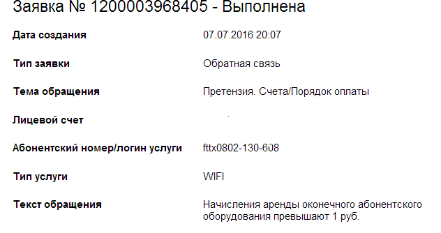 Мне непонятно из ответа РТК в каком месте заявки № 1200003968405 я писал о порядке отключении услуги и о стоимости выкупа оборудования? Копии счетов о начислениях за май и июнь (обнаружилось, что и за 7 дней июля успели 14 руб. аренды начислить) были приложены к заявке.
