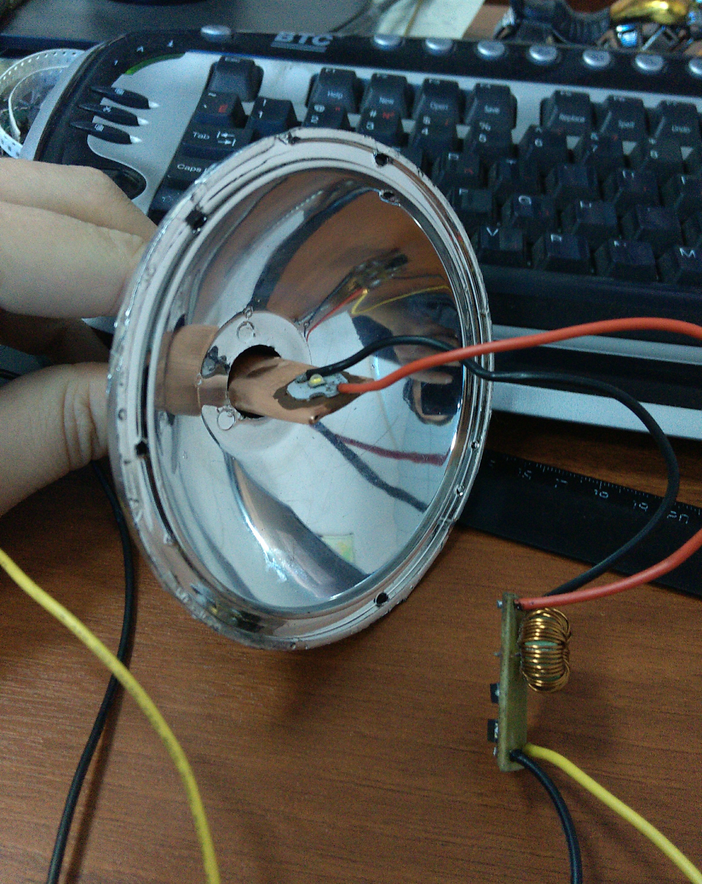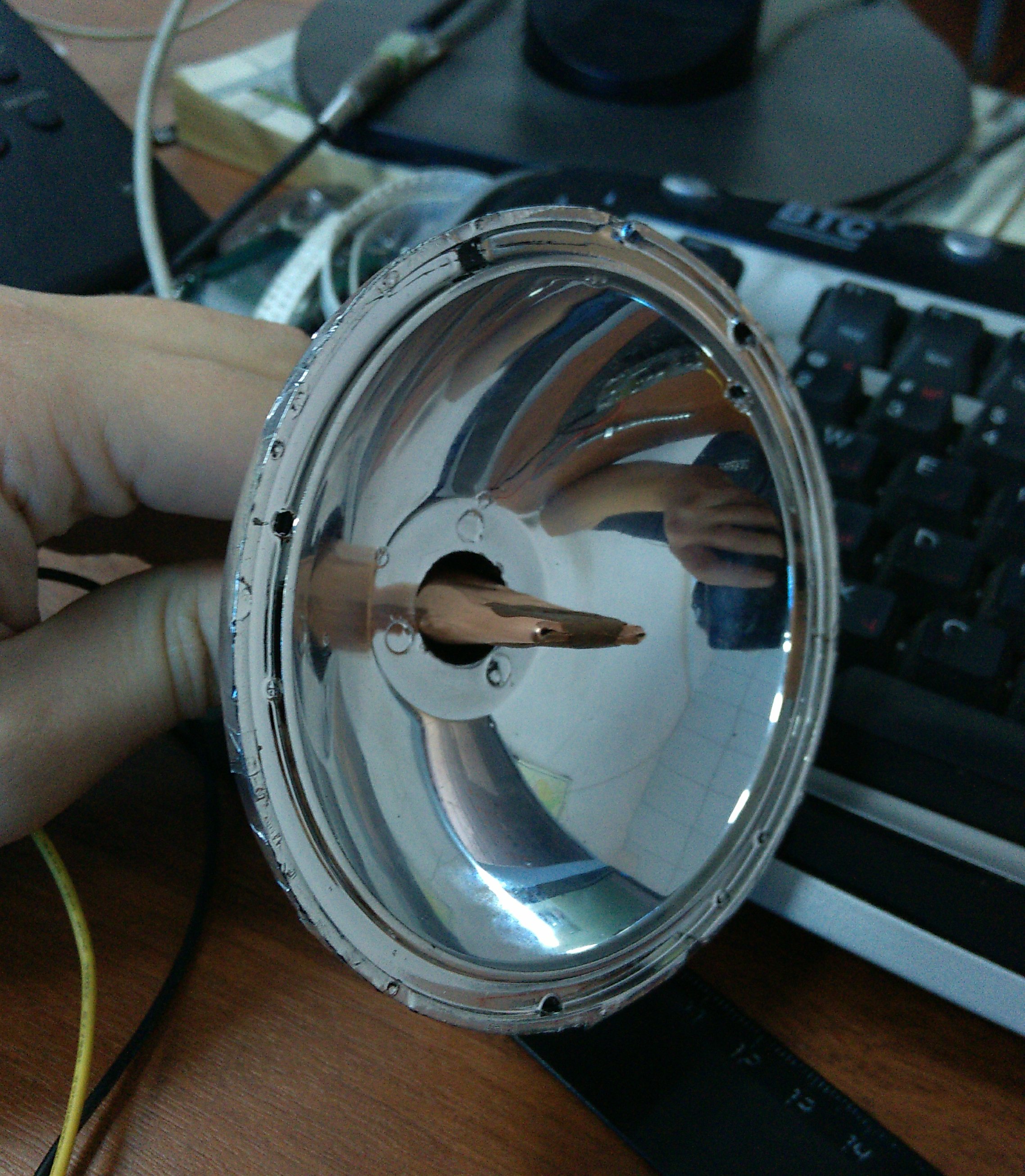 Далее купил медную трубку 15мм. Сплющил один конец и всунул в отражатель. К ней же и будут клеиться на термоклей диоды. Ну и на этом пока всё. Нужно найти хорошую стену для отстройки глубины приклеивания диодов.