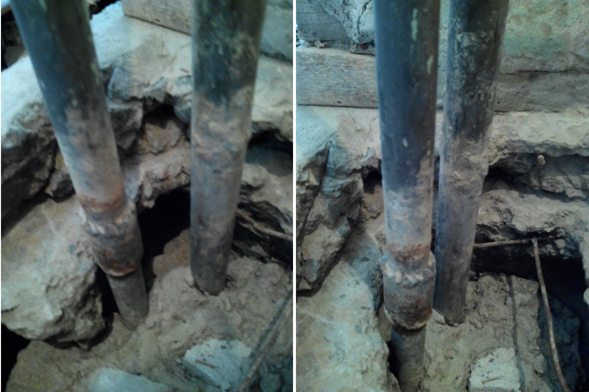 На фото - ничего не долбил - просто раскопал железкой имеющееся (отверстия-то заделаны мягким раствором) - вон какая дырища была в поддоне и перекрытии! (Полтора ведра мусора и песка выскреб оттуда).