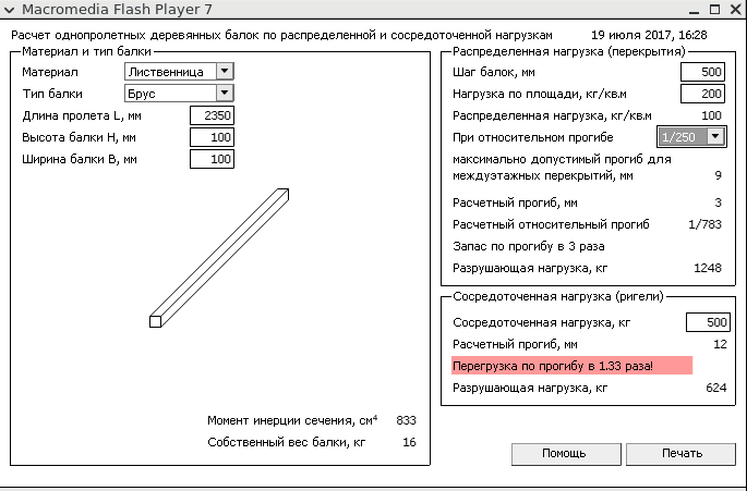 Или положить 100*100 брус и не париться? пролет 2.35 метра, нагрузка сверху небольшая. Сделать шаг поменьше, например 500мм. По расчету более-менее приличная картина получается.