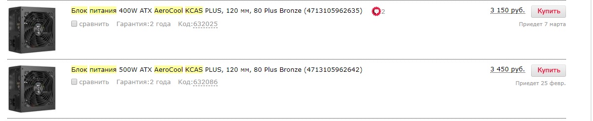 У меня пока Aerocool 500 ватт 5 месяцев отработал без нареканий, но я их меняю каждые 5 лет. Вот в начале октября поменял. Стоял Chieftec на 600 ватт, но за 6 лет работы пищать стал после выключения. Поставил его с основного компа на дачный. Ещё поработает. Если 500ваттник работает в половину нагрузки, то это хорошо для него, не в напряг. Карта у меня 960 и проц i7 прмерно 200 ватт кушают и 2 SSD + 4 HDD примерно 50 ватт. Вобщей сложности комп берёт 250-300 ватт. Так что 500 Ватт БП самое то для него. |