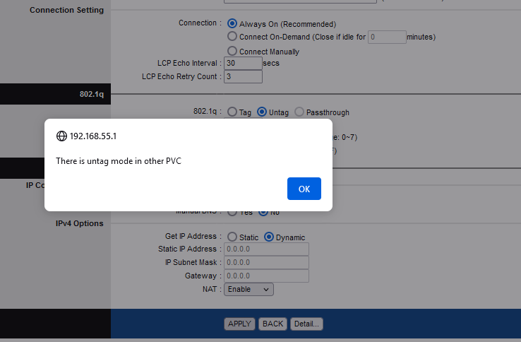 Да, я понимаю, но в dasan у меня не получается выставить untag не на один wan, при попытке применить untag ругается в ответ "There is untag mode in other PVC"