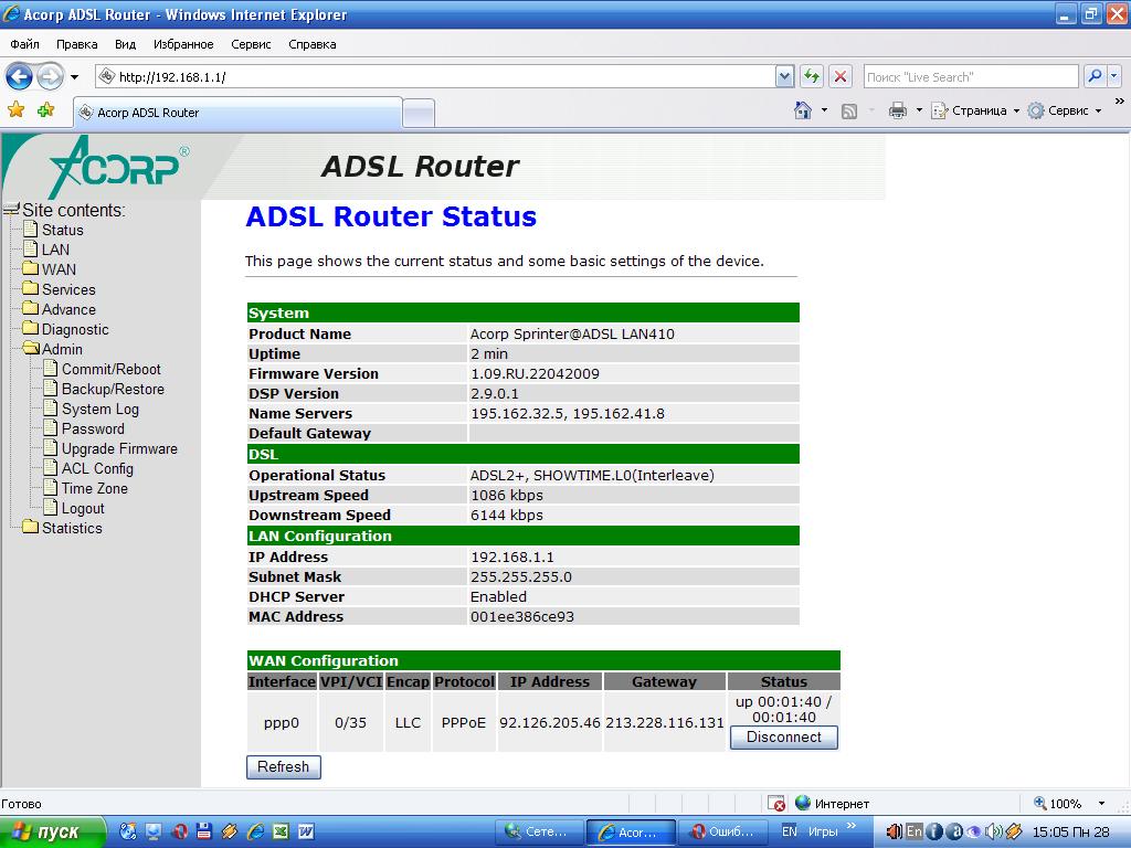 Точно, немного напутал, Idle Time при постоянном подключении не должно быть активно. В остальном - сейчас все должно работать норм, а модем с Acorp-овской прошивкой будет работать с любым типом Annex, который можно выставить на странице выбора модуляций. |