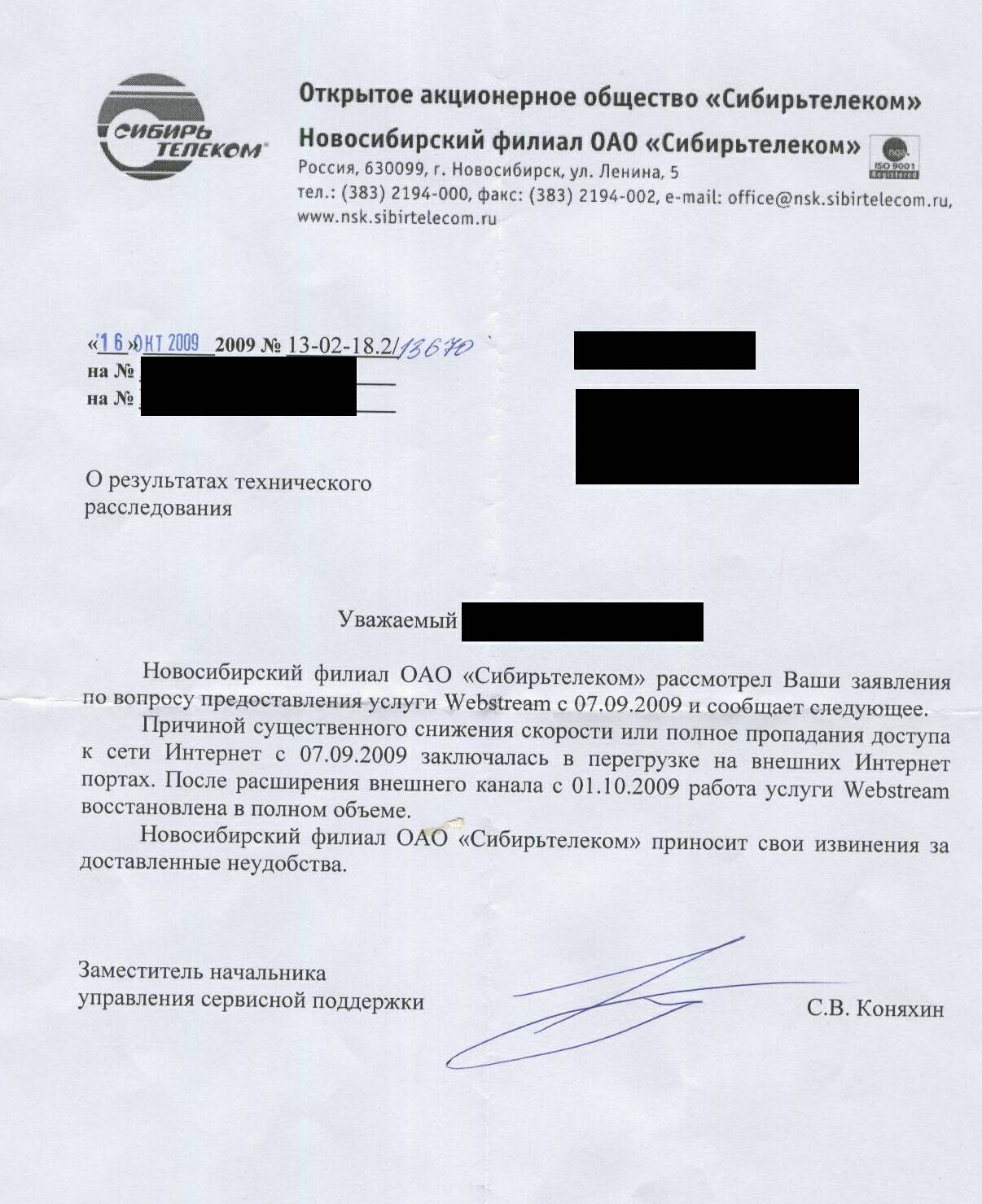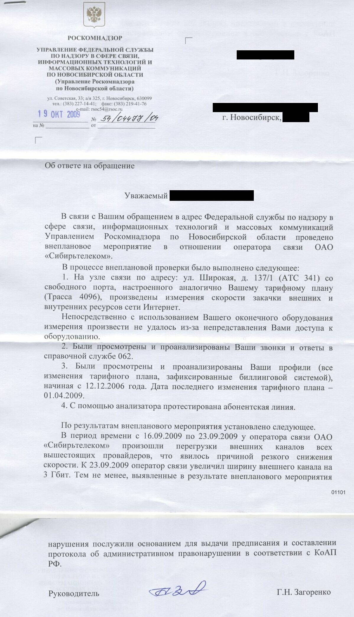 Ответ Управления федеральной службы по надзору в сфере связи, информационных технологий и массовых коммуникаци по новосибирской области и самого "Сибирьтелекома".