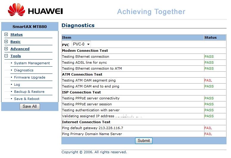| Опа, оказывается то, что модем не может пройти последние два теста до шлюза и днс это нормальное явления. Ну по крайней мере, так говорит сотрудники службы поддержки.