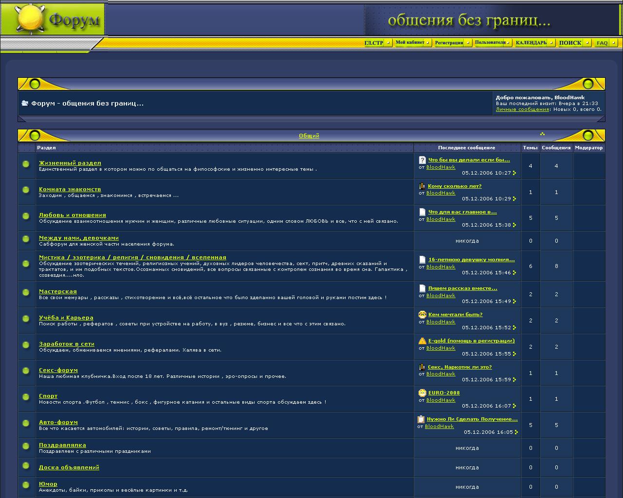Я кончено все понимаю... но смысл плодить форумы??? Народу и так не много, а если он еще разойдется по 10 форумам Имхо тут либо нужно узкоспецализированный форум делать... либо вообще форум убирать и делать сайт для начала.. а потм когда обрастется посетителями делать форум. |