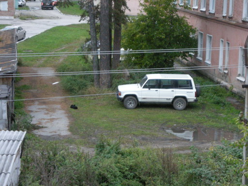 Пока жила 2 неделе в Бердске, наблюдала из окна такую картину: вечером человек возвращается домой на машине, пока паркуется, его уже ждет собачка, он открывает дверь, выходит, а она тут же туда запрыгивает, он закрывает ее и уходит... И только потом до меня дошло, что это СИГНАЛИЗАЦИЯ. А утром как правило было так (черное пятно слева - это та собачка, которая спит после ночного дежурства):