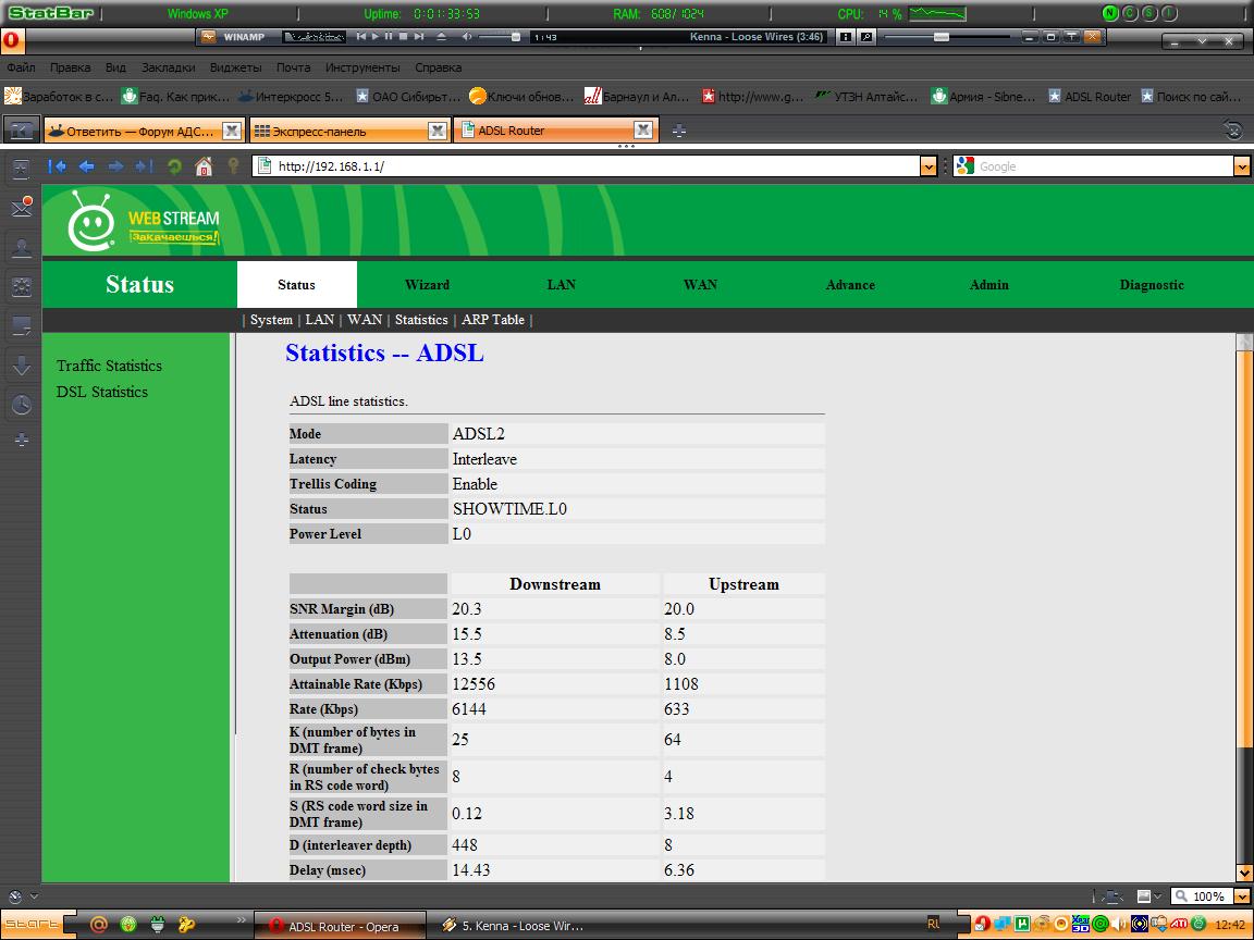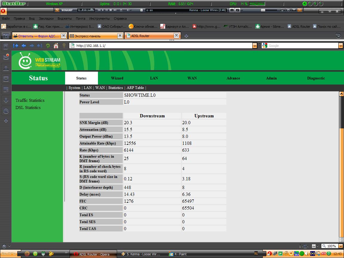 | Много ошибок по исходящему каналу, кривой профиль, скорее всего. Удаленность от AТС небольшая, модуляция почему-то adsl2, а не 2+. Возможно, отключена на DSLAM, либо проблема на линии (плохой контакт).Последний раз редактировалось: rendy (Ср 16-12-09 : 14-06), всего редактировалось 1 раз |