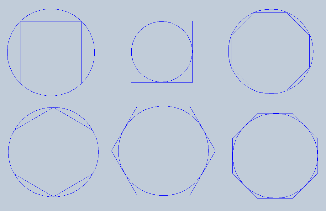 Нужны рисунки с геометрическими фигурами, а именно: Правильный треугольник описанный и вписанный в окружность. Правильный квадрать описанный и вписанный в окружность. Правильный шестиугольник описанный и вписанный в окружность. Правильный восьмиугольник описанный и вписанный в окружность.