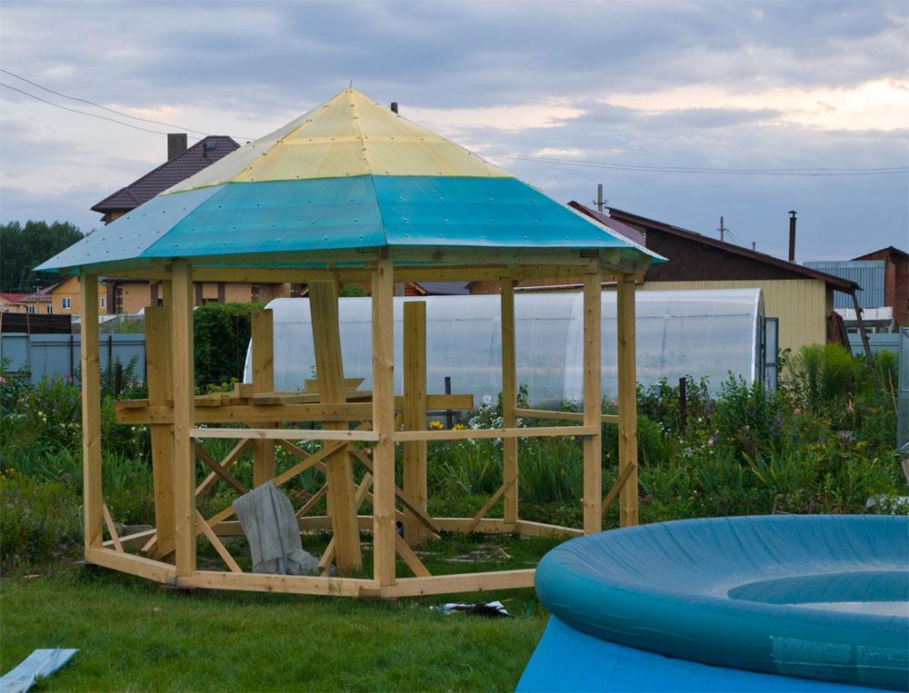 Тут фишка в другом: когда я стал задумываться, чем крыть 8-угольный шатёр, и прикидывать ценники для каждого типа кровли, как ни странно, вполне по деньгам оказался именно поликарбонат (дешевле - только рубероид ). А цвета - ну, такие приняты у нас на даче: дерево, зелёный и жёлтый. |