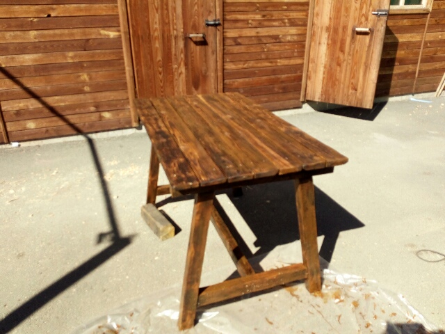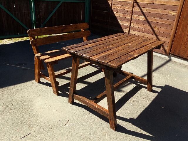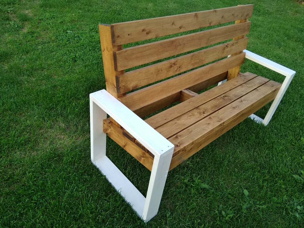 Сделал новую из сосны. Подлокотники покрыты белым антисептиком. Остальное маслом для садовой мебели цвета Тик.