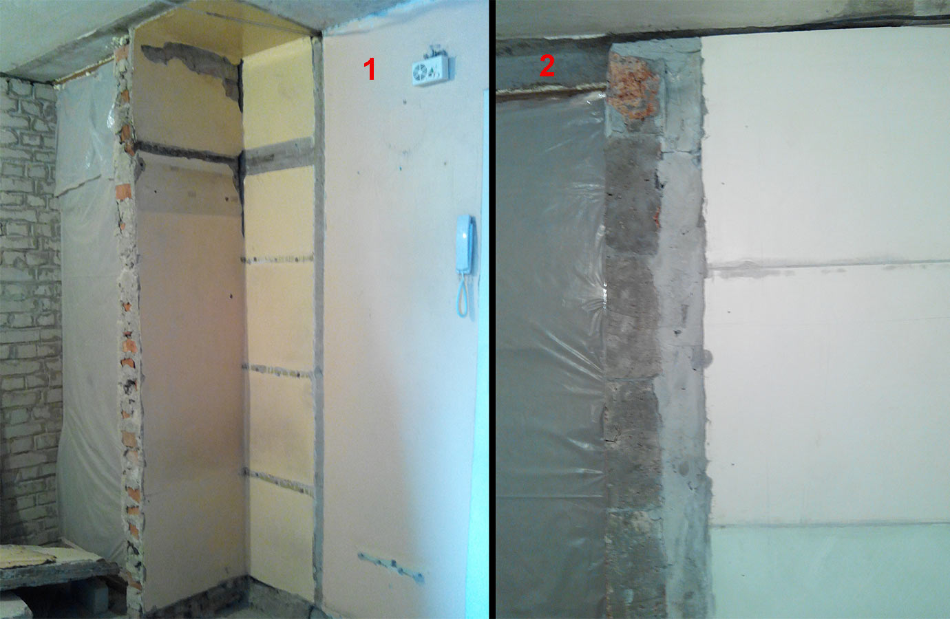 Цифра 2: восстановленная стена ванной (вид изнутри) с нишей под шкаф.