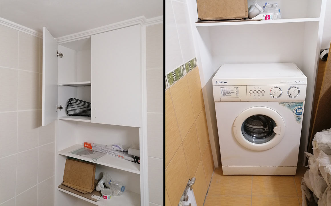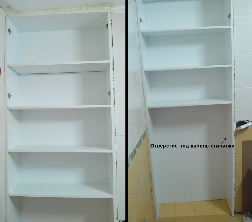 В правой стенке шкафа проделано отверстие для кабеля к блоку розетка-выключатель, чтоб шнур стиралки не тянуть снаружи и втыкать в розетку, а просто подключить последовательно выключателю - и включать во время стирки...
