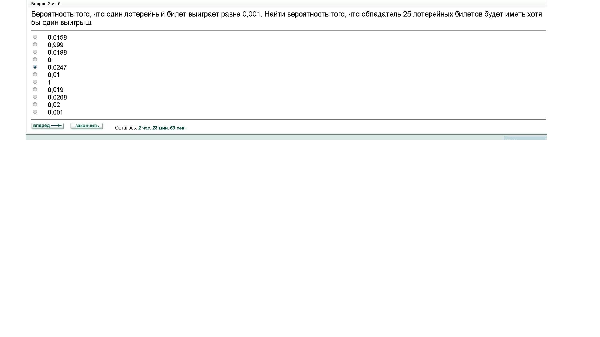Ответ 0,001, если число билетов бесконечно (а о числе там ничего не сказано). А по-вашему получается, что чем больше билетов, тем меньше шанс выиграть. |
