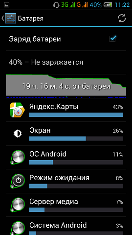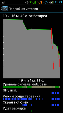 Итого всего 40% за 2 часа активной работы с включеным 4,5" экраном! (на скрине красные полосочки)