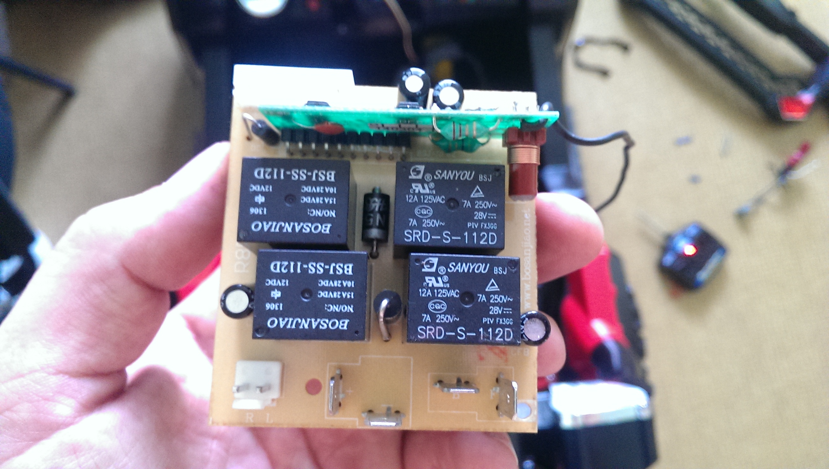 | Я правильно понимаю что паралельно педали у малыша под ногой, вы можете ещё с пульта управлять этой машиной? Мне видится радиоканал на этой плате с реле на фото. |