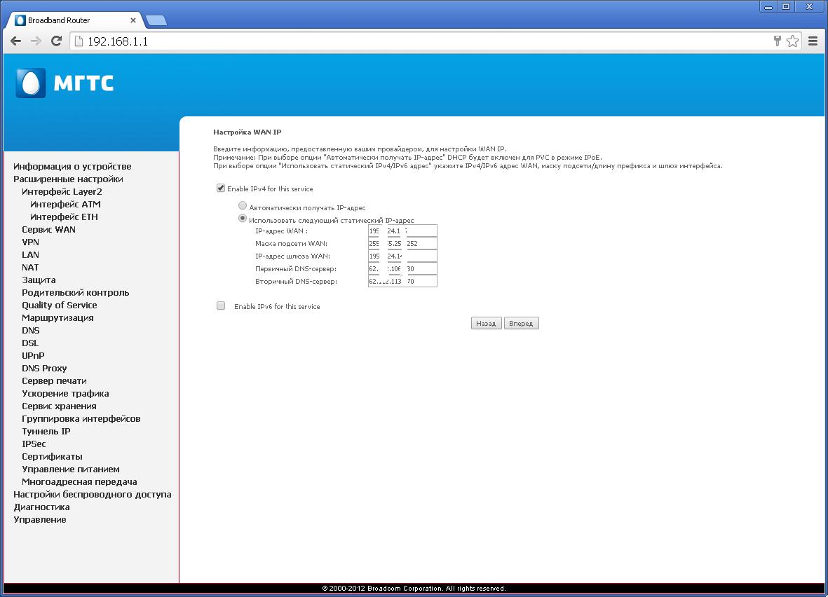 Установили эту шайтан-коробку. Вроде установщик настроил, вроде проверил, но не работает. Нам по тарифу предоставили статический IP, но при настройке мне объяснили, что IP будет на компе, и роутером я смогу пользоваться только как модемом. У нас всего 2 компа, и городить ещё идин роутер смысла не вижу. Когда я попросил, что бы установщик сразу настроил в режиме роутера, он ответил, что так не бывает. Вот, теперь думаю, то ли установщик такой ..., то ли я, то ли железка. В общем, потыкал настройки, создавал PPPoE - ничего не выходит. Помогите, если кто имел опыт подобной настройки. После сброса, как роутер он работает, так что вопрос в том, как его заставить работать со статическим IP у МГТС.