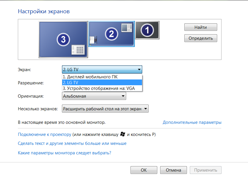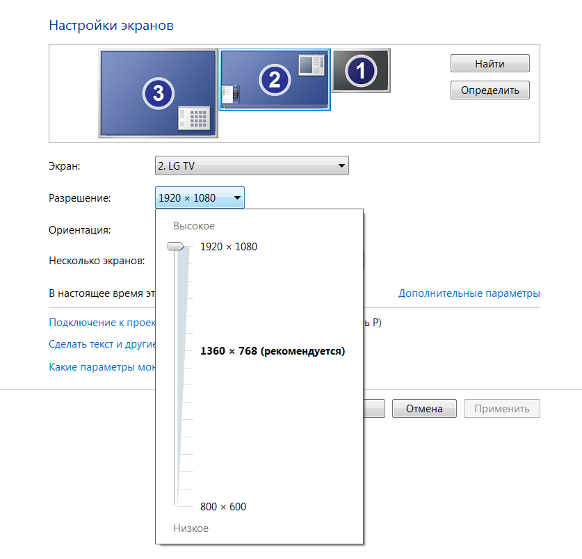 но монитор ноута 1360, а у монитора 800, а у телека 1920. Выбираю в разрешении экрана на что выводить изображение. 1,2,3, допустим использую монитор он по вга подключен, телек и моник ноута молчат, использую моник ноута то молчат телек и моник, использовать тв он по хдми подключен. только на тв выводится. Не куда бегать не надо . Мышкой щелк и все готово.