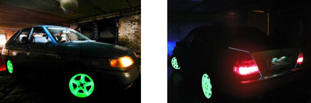 В общем, хочу поинтересоваться. Есть возможность наносить на автомобиль изображение (любые рисунки) светящимся ночью лаком, либо же покрывать им целые элементы. Есть фото только дисков, полностью "окрашенных" подобным образом. Из цветов есть зеленый синий и фиолетовый(это цвета свечения. Сам лак бесцветный и полностью прозрачный).Собснно вопрос: интересно кому-либо подобные вещи?
